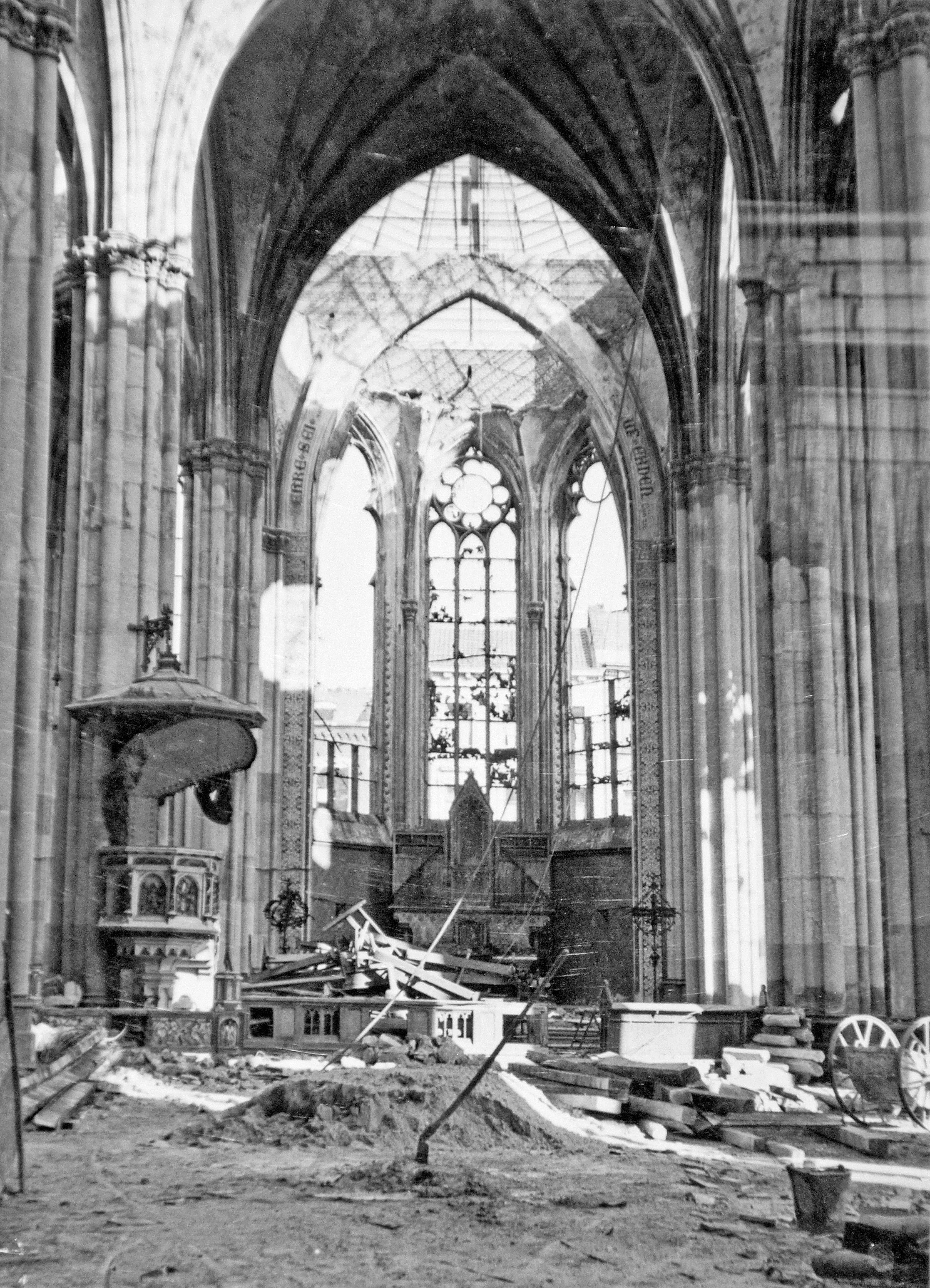 Vor 70 Jahren am 28. Mai 1944 schlugen Bomben in St. Josef ein und zerstörten die Kerzensakristei, den Flankierungsturm und große Teile des Gewölbes. Es war ein kurzer und heftiger Angriff von nur 12 Minuten mit 135 Flugzeugen der Briten, der in der Hauptsache dem Stadtteil Forst galt. Allein an diesem Tag hatte die Pfarre 94 Tote zu beklagen.